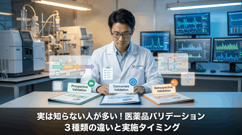 医薬品のバリデーションには大きく分けて3種類のアプローチがあります。「予測的バリデーション」「コンカレントバリデーション」「回顧的バリデーション」の3つです。それぞれ実施するタイミングも目的も異なるにもかかわらず、「なんとなく混同して覚えている」という方がとても多いのが実情です。